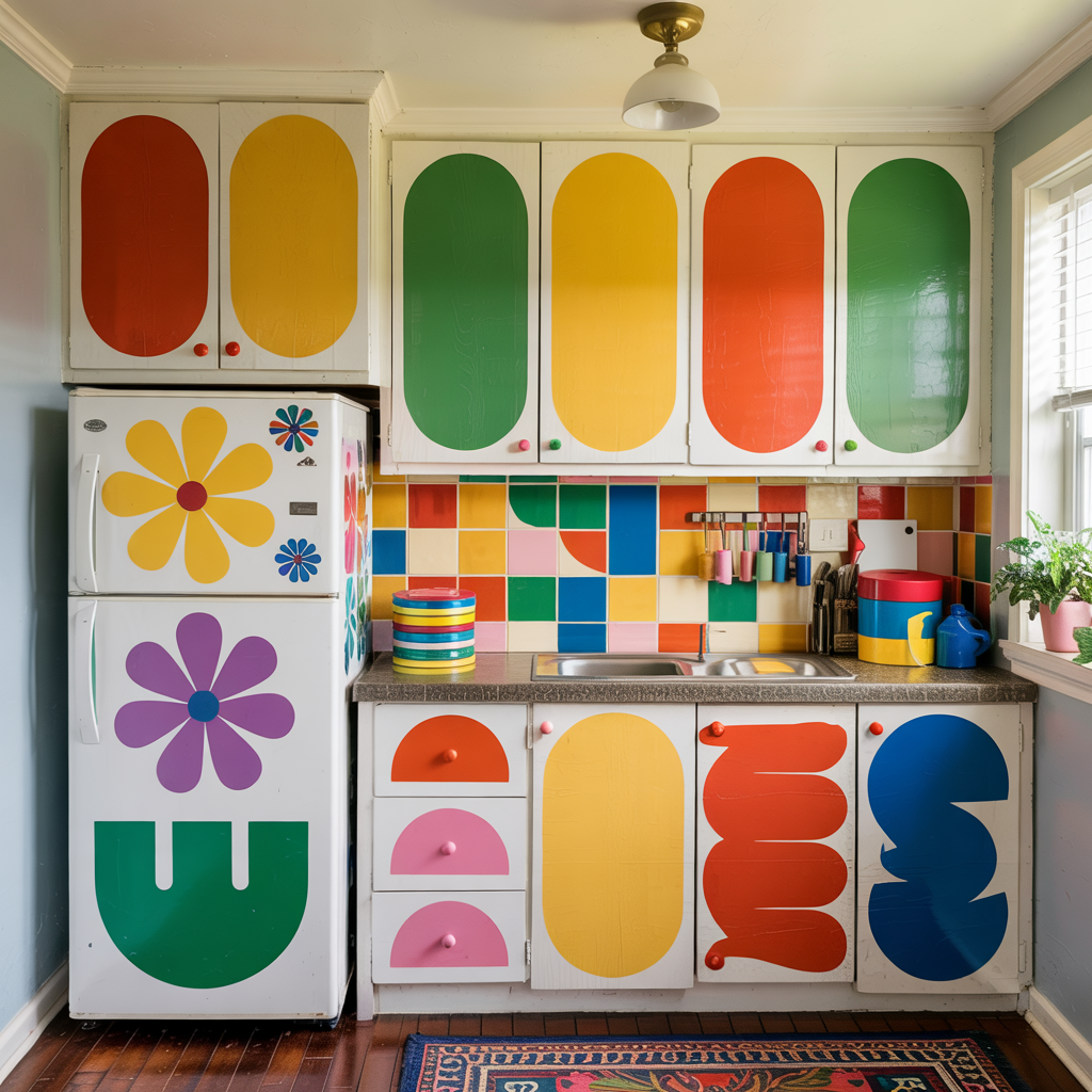 Use adhesive panels or paint-safe methods to color fridge or dishwasher fronts for a cohesive custom kitchen look.