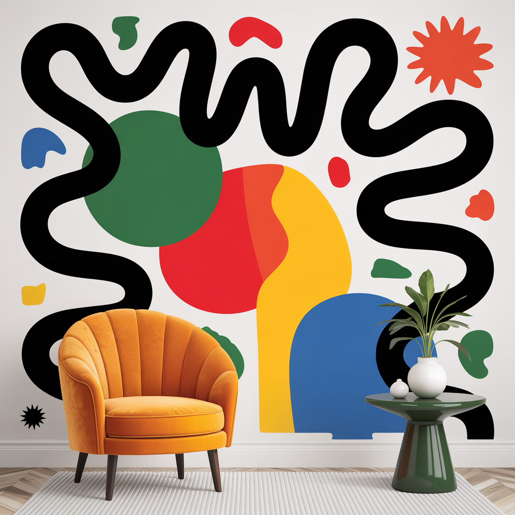 Paint a single wall with thick, free-form black squiggles over a white background. Use a large brush for confident strokes. Add small colored shapes around the squiggles to finish.