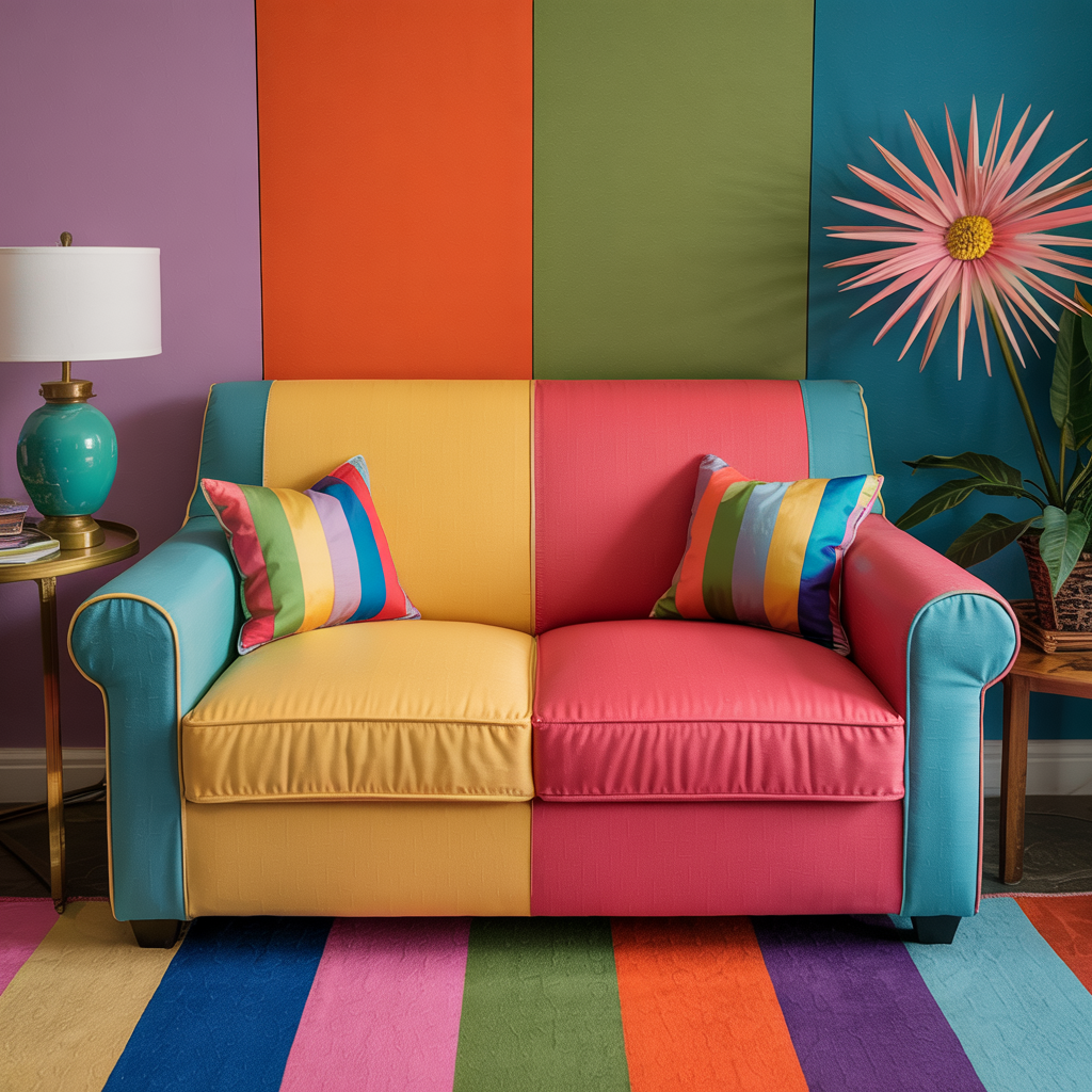 Reupholster or buy a sofa with two contrasting color panels (e.g., teal + coral). Use durable upholstery fabric and sew a simple seam down the center or apply slipcovers for an easier swap.