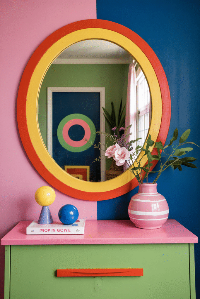 Cut a mirror into an irregular shape or buy one, then frame it with a wide painted border in two-tone contrast.