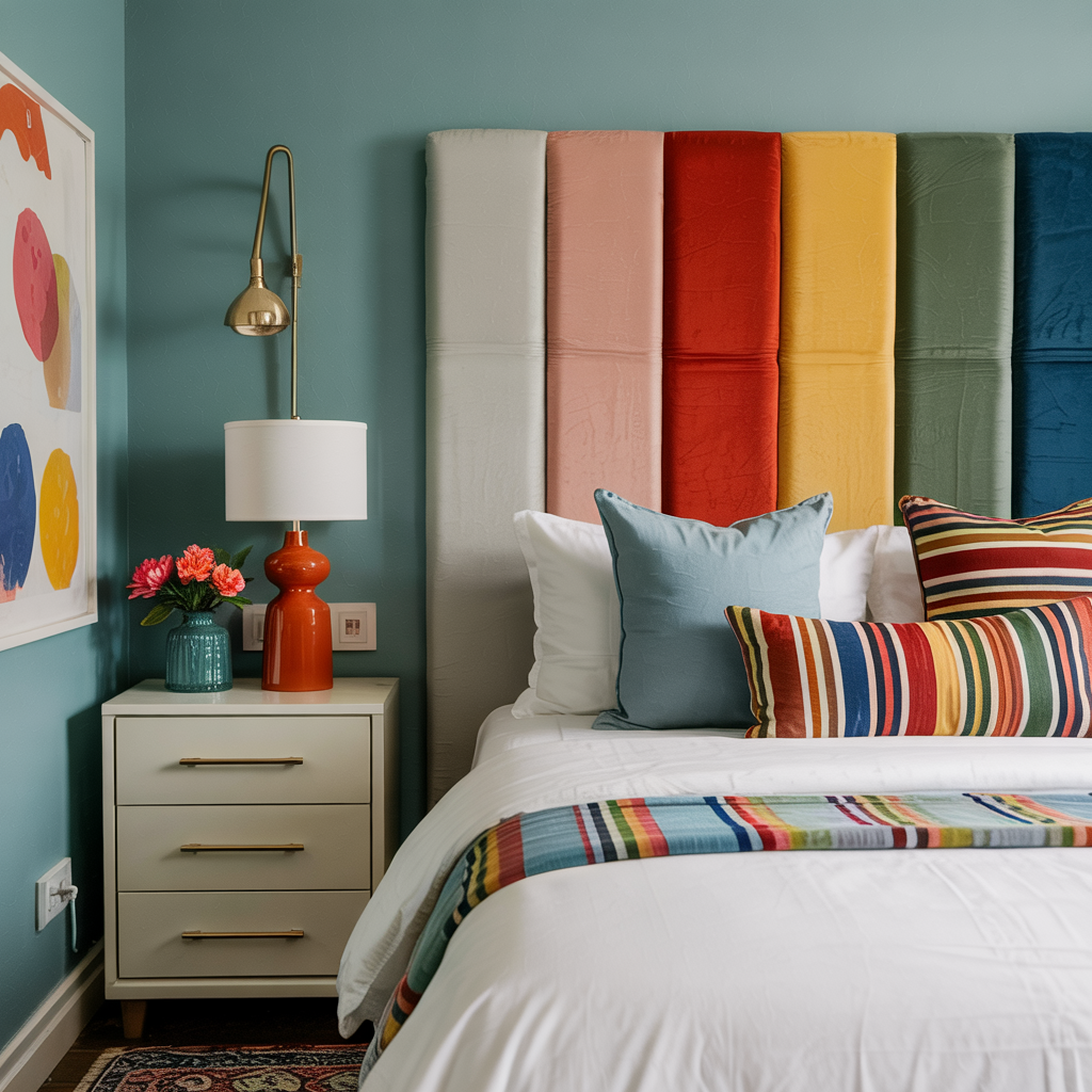 Attach vertical upholstered panels in alternating colors as a DIY headboard—easy to tack on and replace.