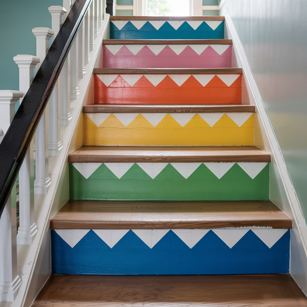 Paint the vertical faces of stair risers in a zigzag pattern. Use painter’s tape to get sharp edges. Keep the treads neutral for safety.