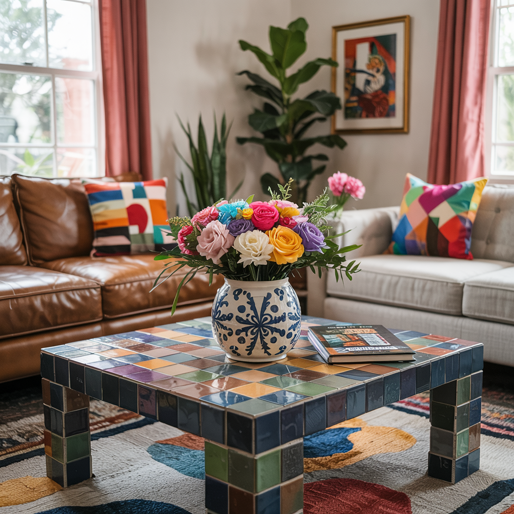 Set a tile mosaic on a coffee table surface using bold pieces and grout in a contrasting color for definition.
