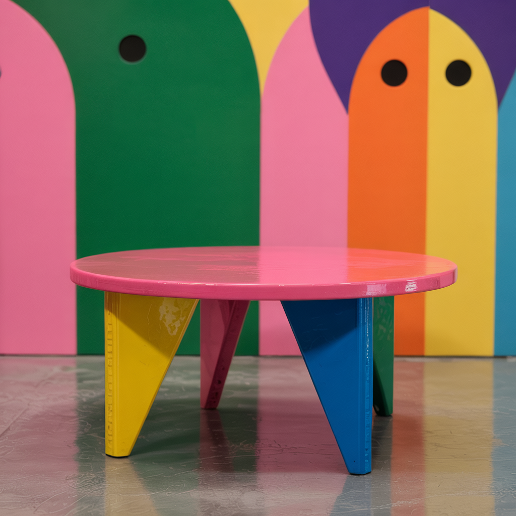 Build a lacquered plywood table with a circular top and triangular legs. Sand, prime, and finish with high-gloss paint. Seal with polyurethane for durability.