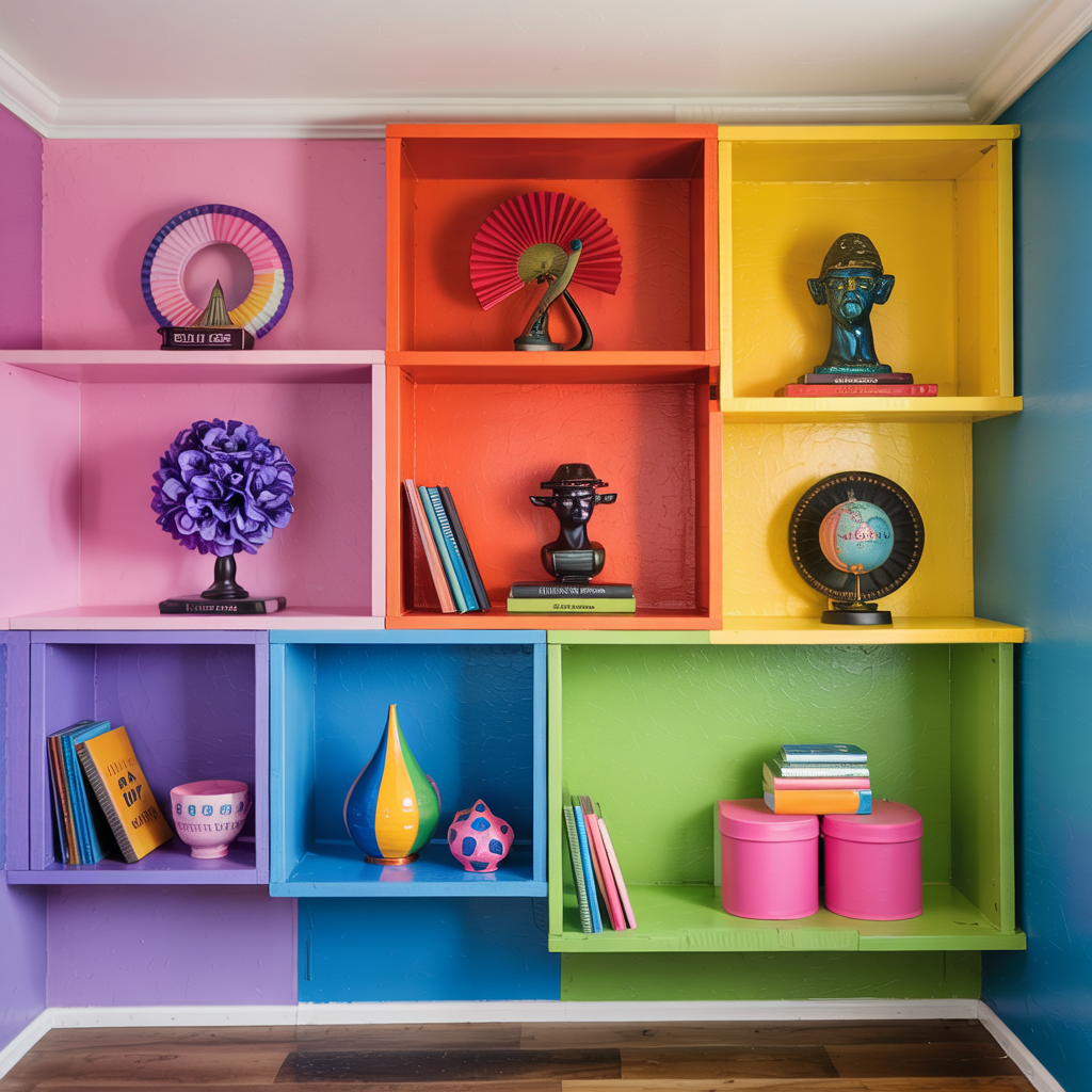 Install wall shelves in varied box sizes and paint each box a different color. Use plywood with clean miters and floating shelf brackets for a professional look.