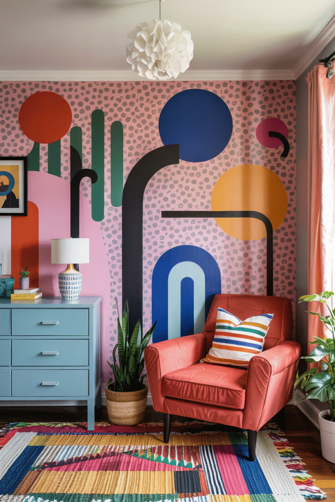 Combine paint, wallpaper tiles, decals, and framed art to create a layered Memphis collage mural — keep one dominant palette for cohesion.