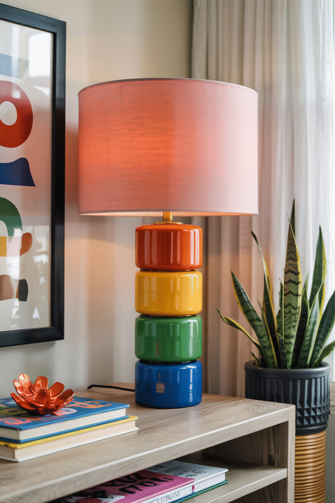 Use lamp bases made from stacked cylinders painted in alternating colors. Top with a solid-color shade that picks up one of the base colors.