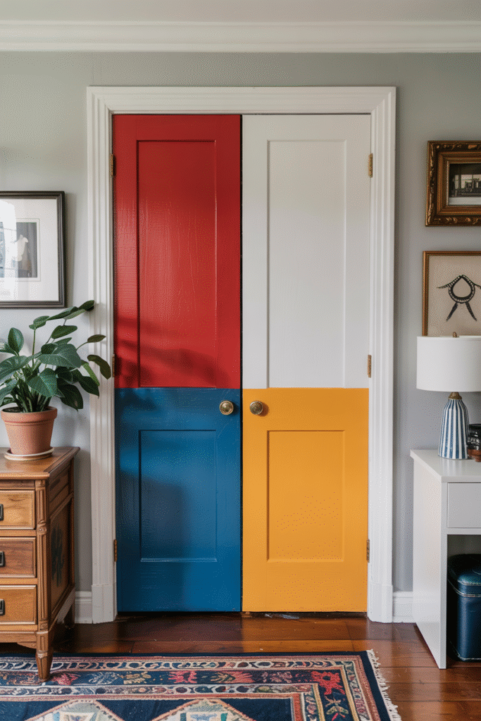 Paint interior or closet doors with two blocks of colors split horizontally or diagonally. Use high-quality primer and satin paint for a crisp edge.