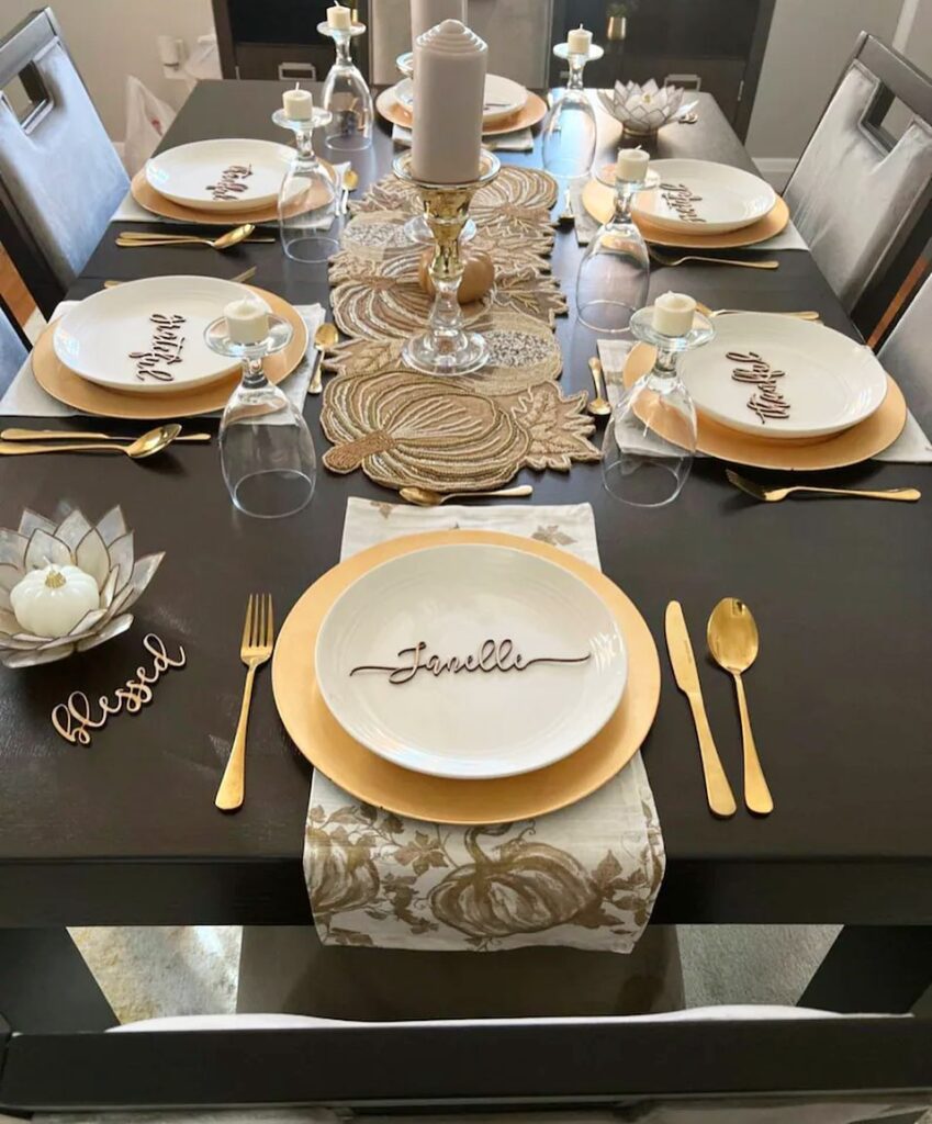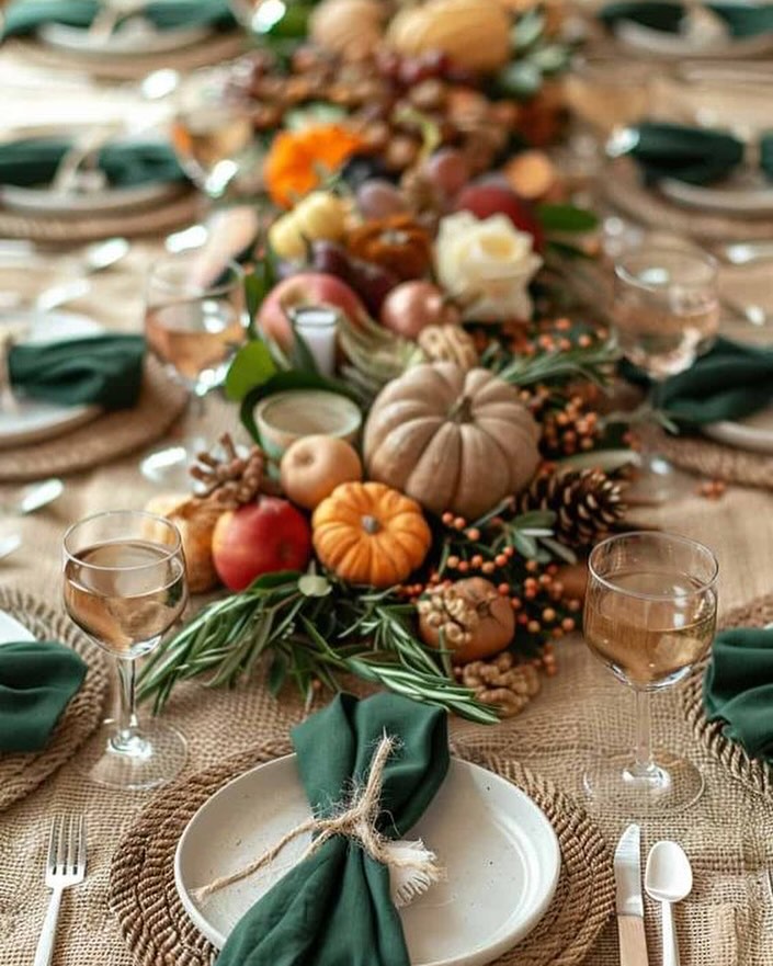 - Burlap and Brass: Drape burlap squares under plates, contrasting with polished brass flatware. Add acorn caps filled with salt for a salty-sweet nod to the meal.