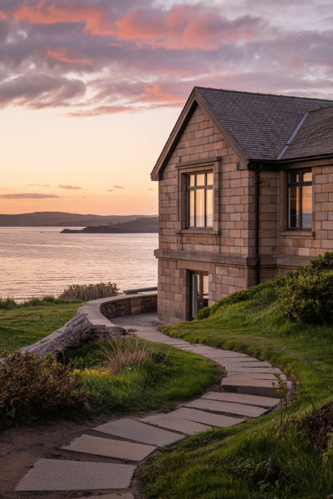 This Ayrshire villa, inspired by the Arts and Crafts movement, features local stone and timber cladding. The interior includes handcrafted fireplaces and stained-glass windows depicting coastal scenes. The estate’s clifftop location offers panoramic views of the Firth of Clyde, with a private beach below.