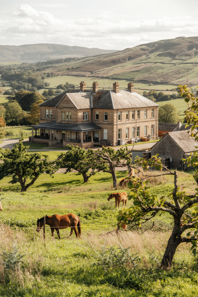 This Borders estate reimagines a farmhouse with Victorian grandeur, featuring a stone façade and a wraparound veranda. The interior includes a cozy kitchen with an Aga and a library with built-in shelves. The grounds include orchards and a paddock.