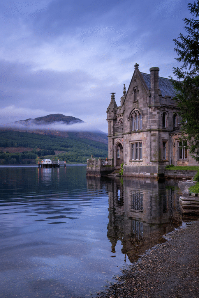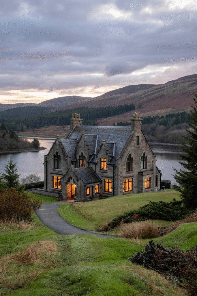 This Loch Ness mansion combines Gothic Revival elements with Victorian opulence. The exterior features pointed arches and gargoyles, while the interior boasts a library with leather-bound books and a dining room with a massive chandelier. The estate includes a boathouse and a private pier.