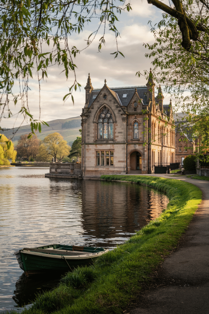 Set along the River Tay, this Gothic Revival villa features pointed arches and a stone façade. The interior includes a vaulted ceiling in the drawing room and a dining room with stained-glass windows. The estate’s riverside gardens include a boathouse and a willow-lined path.