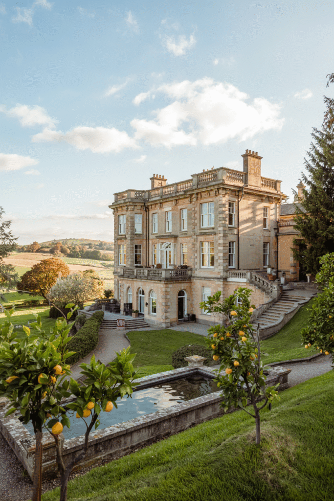 Set in the Borders, this neo-classical mansion features a pedimented façade and Ionic columns. The interior includes a grand atrium with a skylight and a dining room with frescoed walls. The estate’s grounds include a formal parterre garden and a small vineyard.