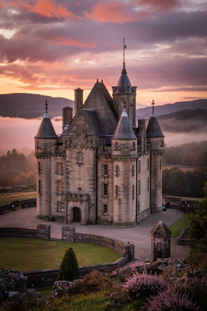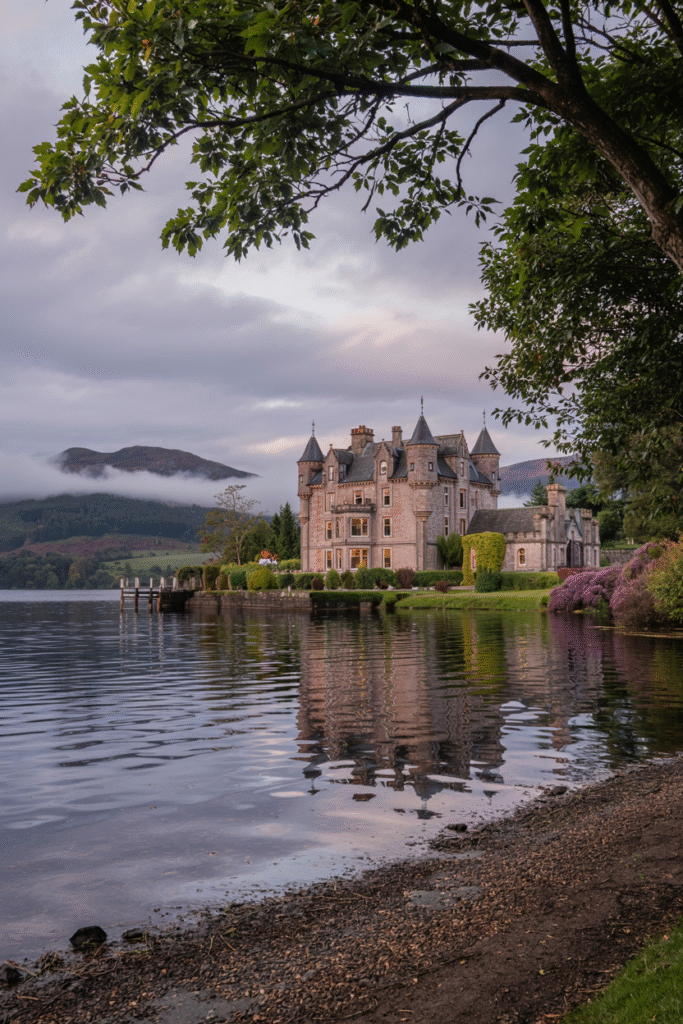 This Loch Tay mansion features crow-stepped gables and conical turrets. The interior includes a grand staircase and a drawing room with loch views. The estate’s grounds include a private pier and a walled garden.