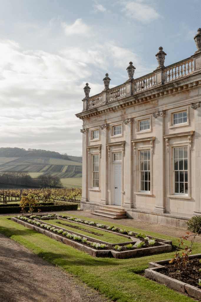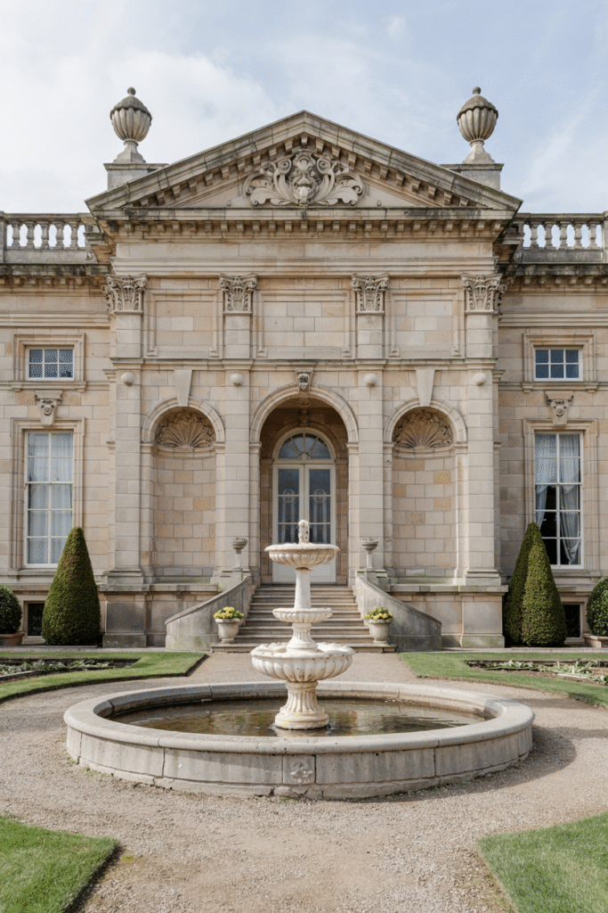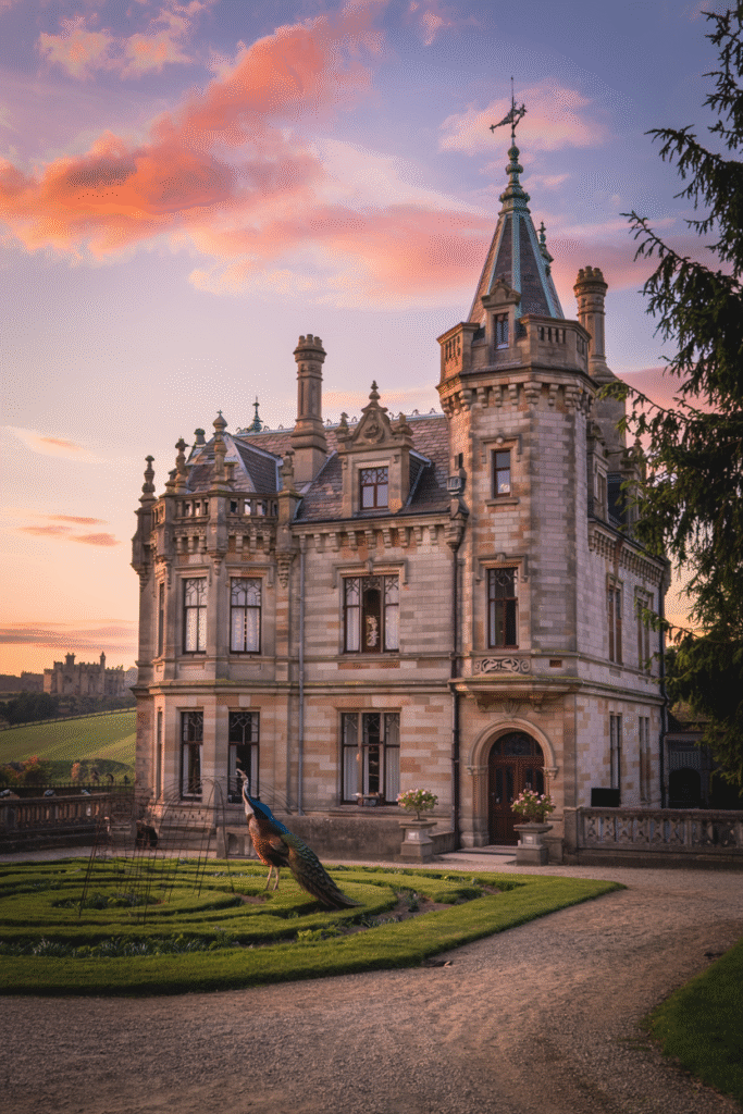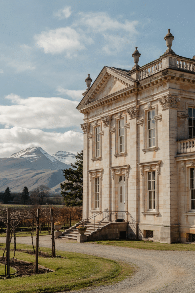 Inspired by Palladian ideals, this Stirlingshire mansion features a symmetrical façade, pedimented windows, and a grand portico. The interior includes a marble-floored entrance hall and a ballroom with crystal chandeliers. The estate’s formal gardens are laid out in geometric patterns, with a central fountain as the focal point.