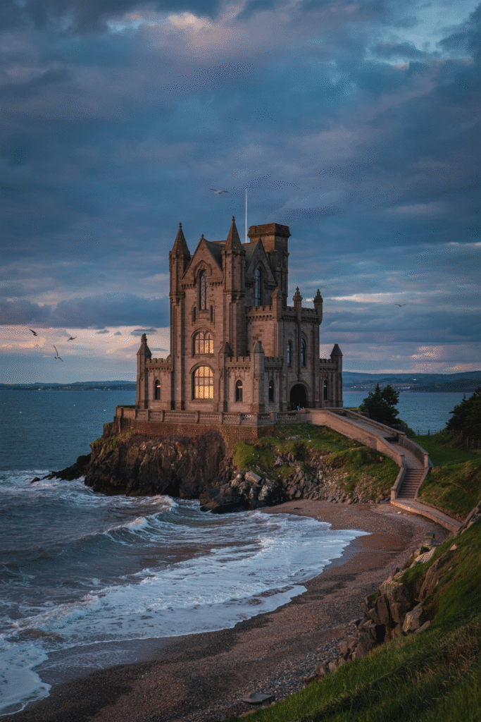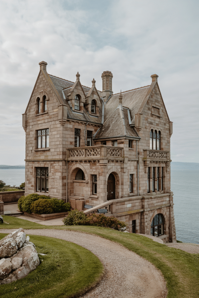 Perched on a cliff in Ayrshire, this Neo-Gothic castle features pointed arches and gargoyles. The interior includes a library with leather-bound books and a dining room with a massive chandelier. The estate includes a private beach and a clifftop garden.