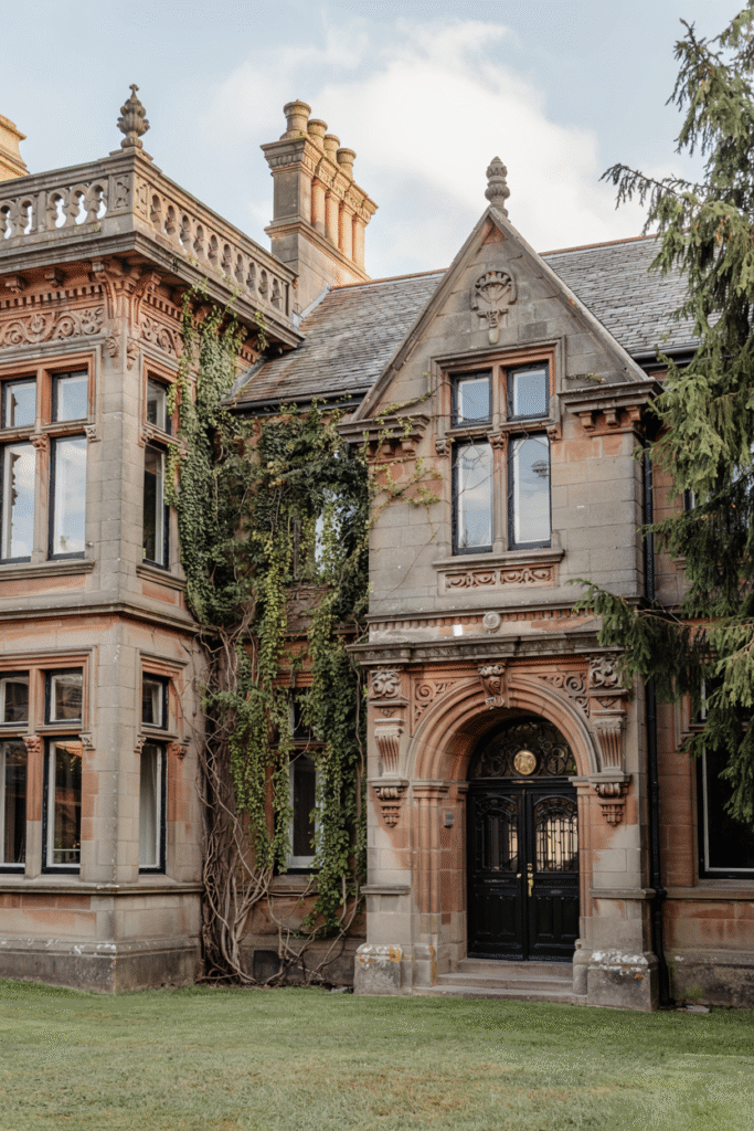 This Aberdeenshire estate features ornate gables and mullioned windows. The interior includes a galleried hall and a billiards room. The estate’s grounds include a riverside path and a formal rose garden.