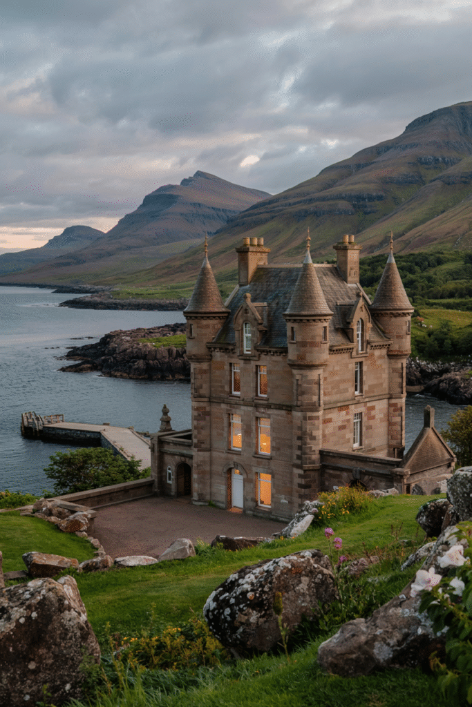 Perched on a cliff in Argyll, this Gothic Revival manor features pointed arches and a stone façade. The interior includes a library with leather-bound books and a dining room with a massive chandelier. The estate includes a private beach and a clifftop garden.