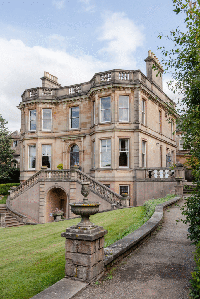 This Stirlingshire villa features a stucco façade, low-pitched roofs, and bay windows. The interior includes a grand atrium with a chandelier and a conservatory filled with ferns. The estate’s grounds include terraced gardens and a reflecting pool.