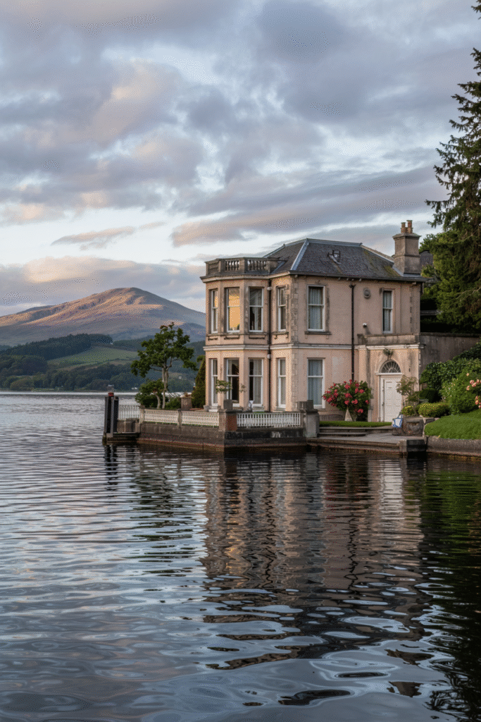 This Loch Lomond house features a stucco façade, low-pitched roofs, and bay windows. The interior includes a grand atrium with a chandelier and a conservatory filled with ferns. The estate’s grounds include a private dock and a rose garden.
