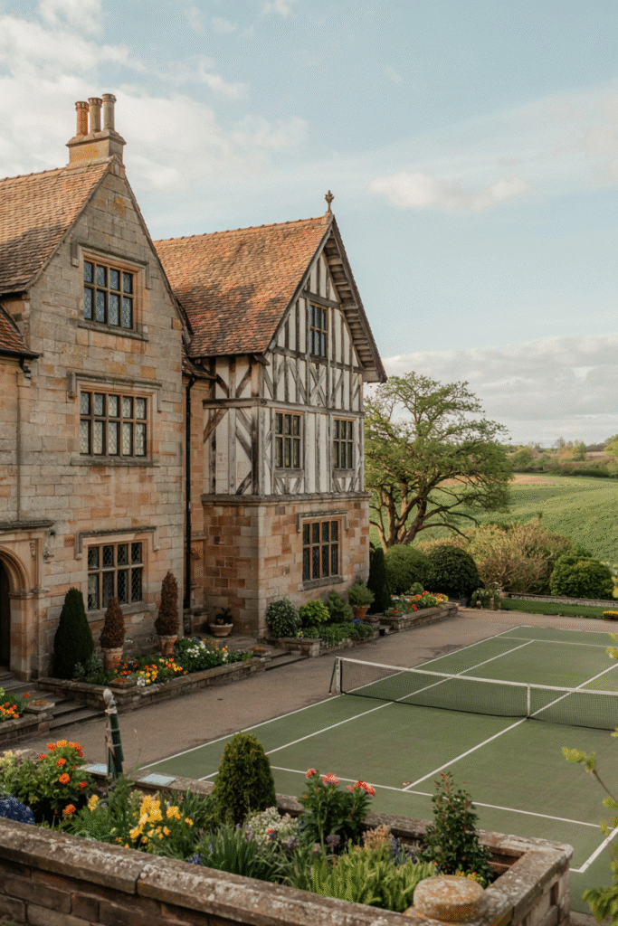 This Fife estate combines Tudor Revival elements with Victorian scale, featuring half-timbered gables and leaded windows. The interior includes a great hall with a minstrels’ gallery and a dining room with a coffered ceiling. The grounds boast a sunken garden and a tennis court, perfect for leisurely afternoons.