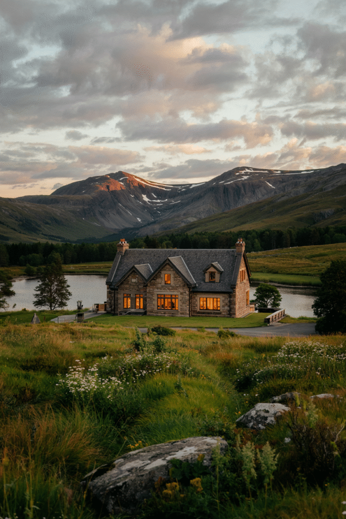 This Loch Ness villa features a stone and timber façade. The interior includes handcrafted woodwork, a cozy library, and a sunroom overlooking the loch. The estate’s grounds include a wildflower meadow and a private pier.