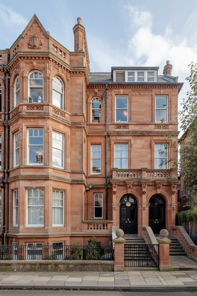 Drawing from the urban tenements of Glasgow, this giant house in Ayrshire reimagines the style on a grand scale. Its red brick façade is adorned with ornate stucco details, and bay windows dominate the front. The interior includes a double-height atrium with a skylight, connecting multiple wings filled with cozy parlors and a dining room fit for 20 guests. The grounds feature a formal rose garden.