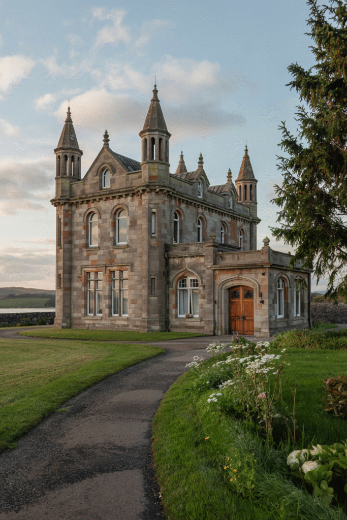 The Scottish Baronial style is synonymous with Victorian Scotland, characterized by crow-stepped gables, conical-roofed turrets, and battlements. Imagine a sprawling red sandstone manor perched on a hillside overlooking the Tweed Valley. The exterior features pointed arches and oriel windows, while the interior boasts oak-paneled walls, stained glass, and a grand staircase with intricate carvings. The estate includes a walled garden with native Scottish flora, such as rowan trees and heather, evoking folklore and tradition.