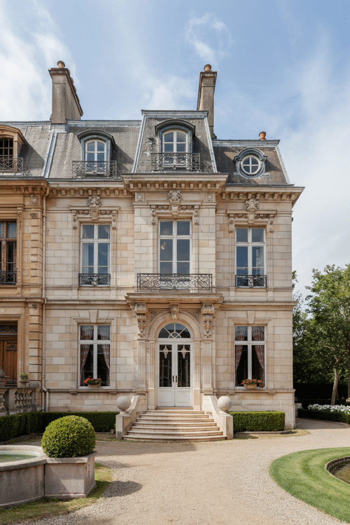 Inspired by French Second Empire architecture, this Aberdeenshire house boasts a mansard roof, dormer windows, and a symmetrical façade. The interior is a showcase of opulence, with chandeliers, gilded moldings, and marble floors. The estate’s formal gardens include topiary hedges and a fountain, evoking the grandeur of Versailles on a Scottish scale.