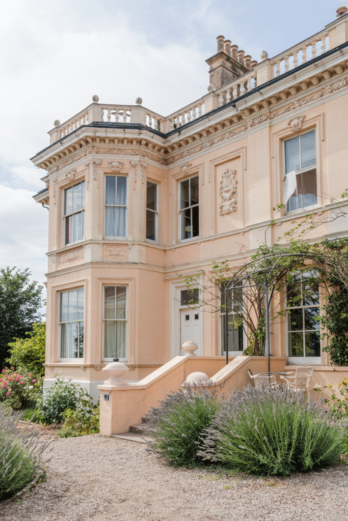 Inspired by the Italian Riviera, this Victorian Scottish House in East Lothian features a creamy stucco exterior, low-pitched roofs, and decorative cornices. Bay windows flood the interior with light, highlighting pastel wallpapers and frescoed ceilings. The estate’s terraced gardens, filled with lavender and roses, cascade down a gentle slope, offering sweeping views of the North Sea. A wrought-iron pergola provides a shaded retreat for afternoon tea.