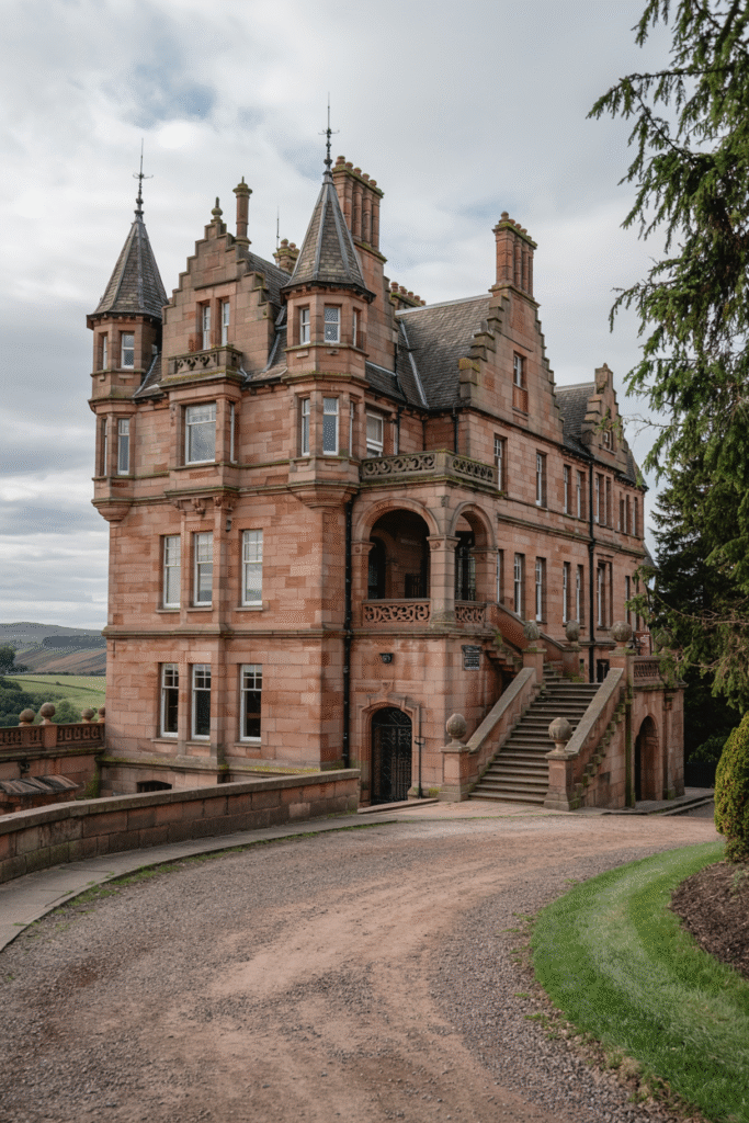 This Roxburghshire house blends multiple styles—Gothic, Italianate, and Baronial—into a whimsical masterpiece. The façade features turrets, bay windows, and stucco detailing, while the interior includes a mosaic-tiled hall and a conservatory filled with tropical plants. The grounds feature a labyrinth and a peacock enclosure.