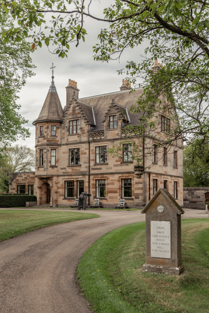 Inspired by medieval tower houses, this Lanarkshire mansion features a central keep with battlements and narrow windows. The interior includes a spiral staircase and a paneled dining room. The estate’s grounds include a moat-like pond and a walled herb garden.