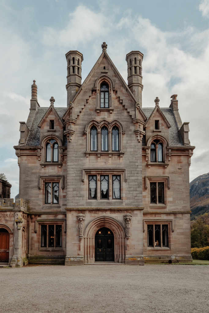 This towering Gothic Revival mansion, set against the dramatic backdrop of the Cairngorms, features pointed arches, ribbed vaulting, and gargoyle-adorned parapets. The house spans three stories with a central keep-like structure, its stone façade weathered to a soft gray. Inside, expect elaborate plasterwork ceilings, a library with floor-to-ceiling bookshelves, and fireplaces framed in dark marble. The estate’s grounds include a private loch, perfect for reflective evenings.